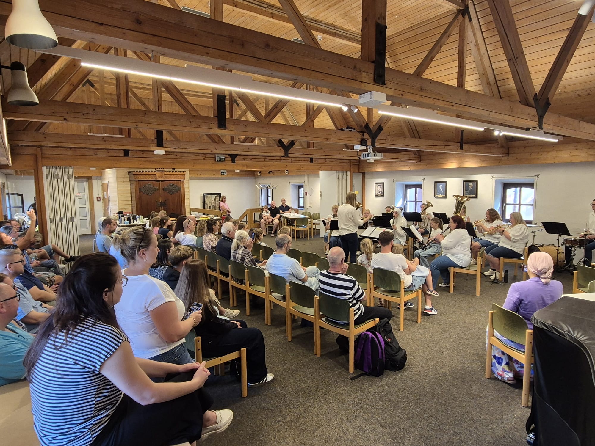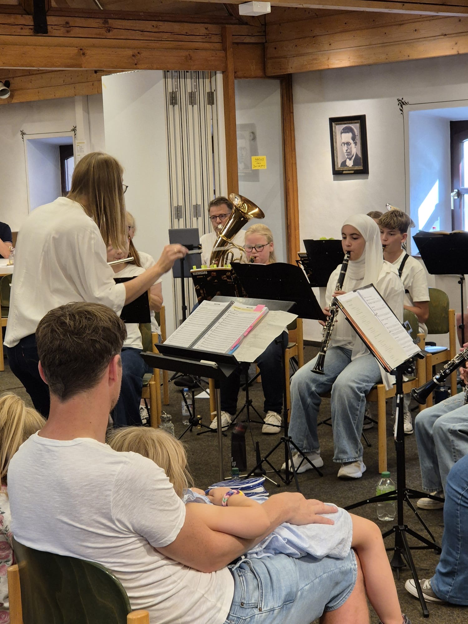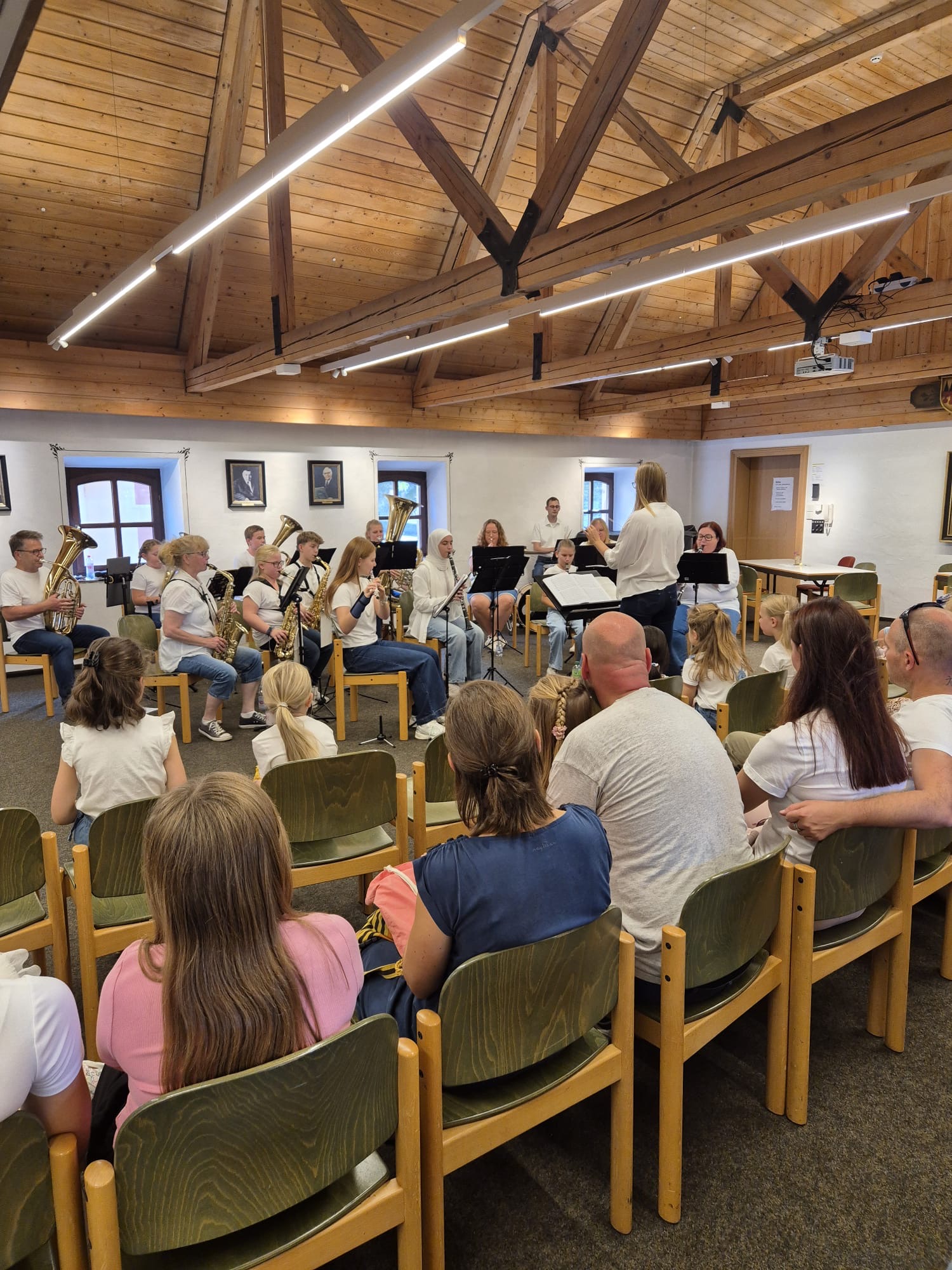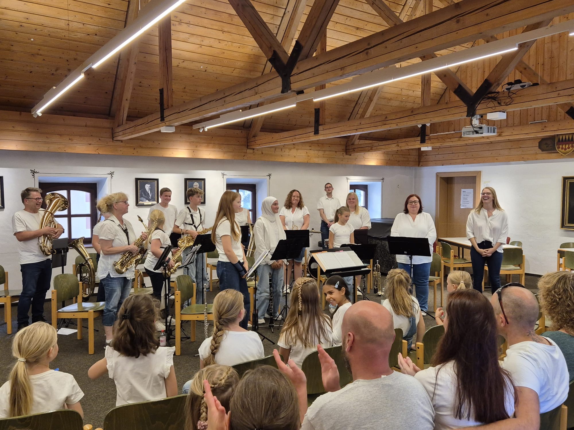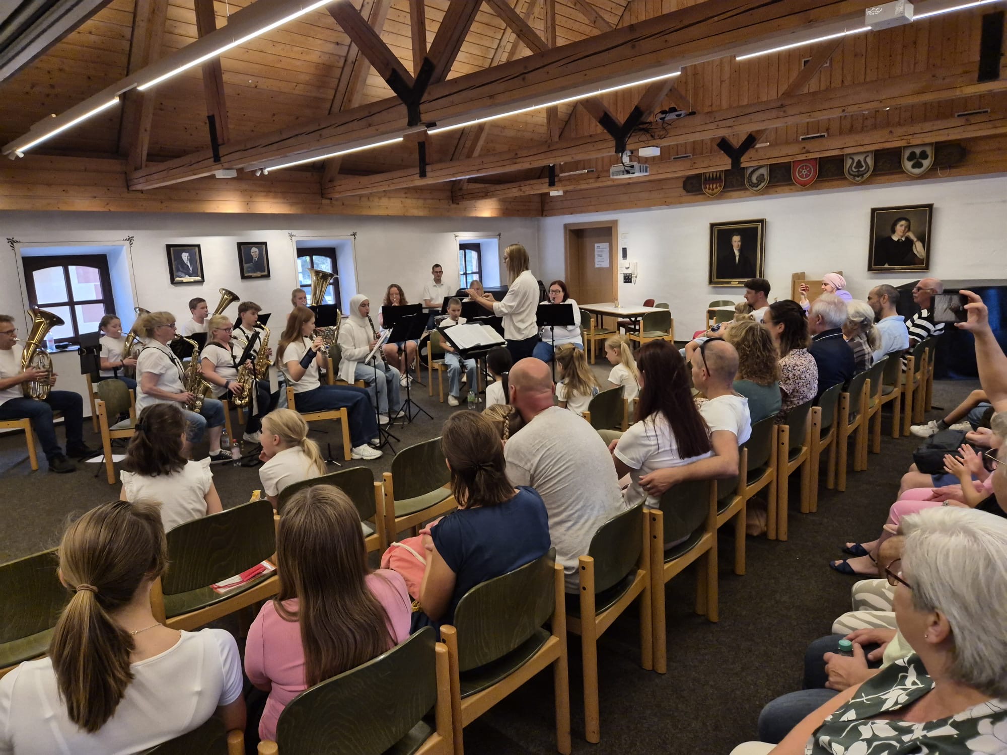 Im Anschluss übernahm das Nachwuchsorchester die Bühne. Unter der Leitung von Dirigentin Theresa Lechthaler zeigten die Kinder eindrucksvoll, was sie in den vergangenen Monaten gelernt haben. Unterstützt wurden sie von erfahrenen Musikerinnen und Musikern der beiden Stammorchester, am Bariton, Saxophon, Schlagzeug sowie an der Tuba und Trompete, die den jungen Talenten zusätzliche Sicherheit gaben und das Klangbild bereicherten.