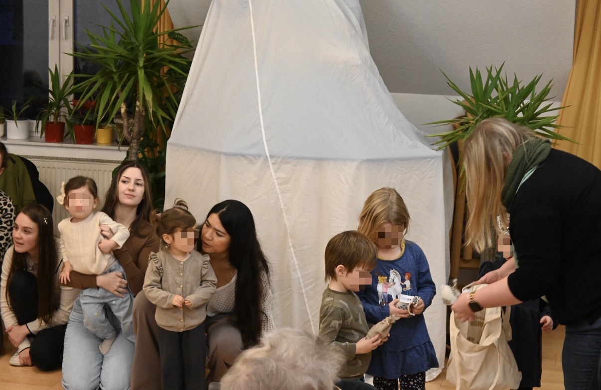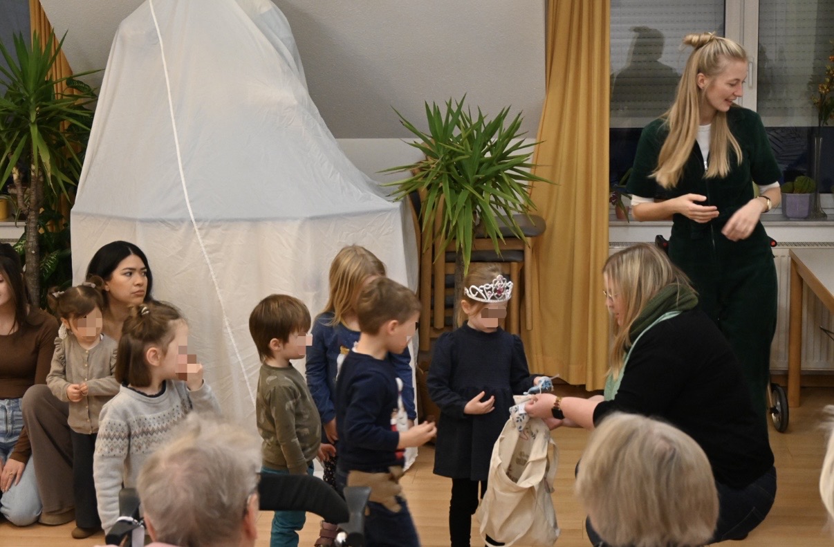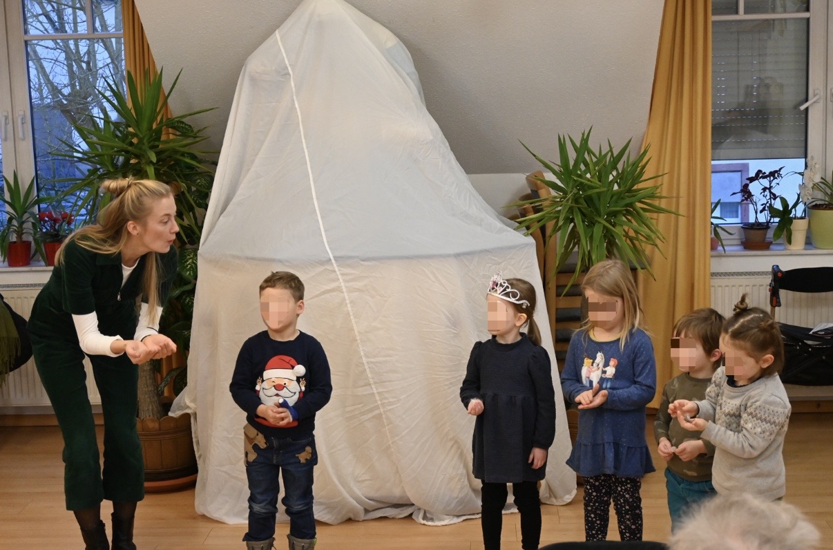 Die Kinder der Musikalischen Früherziehung führten Igel die schlafen, Schnee der von den Bäumen fällt, Bruder Jakob auf Deutsch und Italienisch sowie das Nachtgespenst auf. Dabei liefen die Kinder mit Tüchern über dem Kopf durch den Raum und sorgten für eine besondere gruselige Atmosphäre.